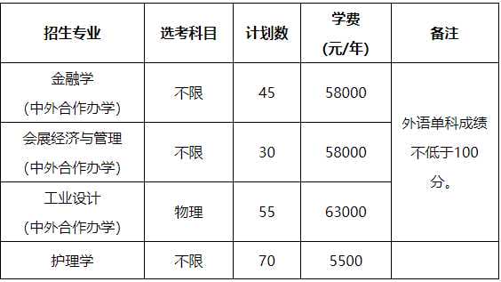 第十六条 金融学(中外合作办学)、会展经济与管理(中外合作办学)、工业设计(中外合作办学)专业宜英语语种考生报考,且填报志愿时,考生外语单科成绩须不低于100分。若非英语语种考生报考并被录取,且不能按规定完成学业者,按学校学籍管理有关规定办理。
